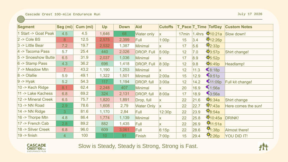 Run steady. Think clearly.Custom race pace cards built for trail and ultra runners.Segment splits.